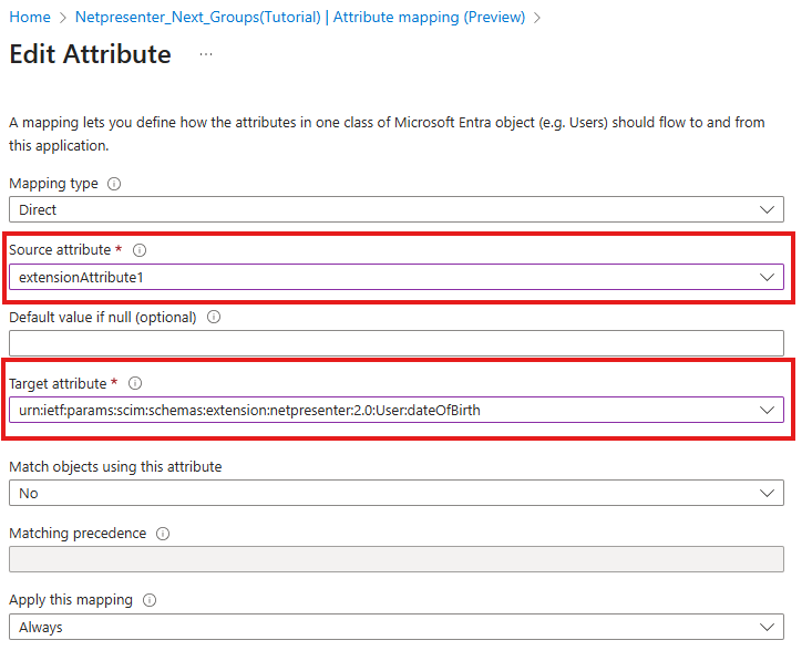 For the target attribute, make sure to use the one that was added int he previous step. And as source attribute, select the attribute that has your employee's date of birth setting configured.